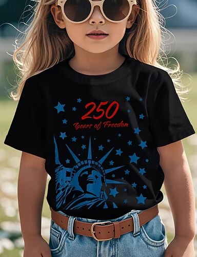 100% Baumwolle Kinder Mädchen Schwarz Weiß Grafik Freiheitsstatue 250-jähriges Jubiläum Amerikanische US-Flagge für Kinder T-Shirt Rundhalsausschnitt Kurzarm Urlaub Sport & Outdoor Alltagskleidung
