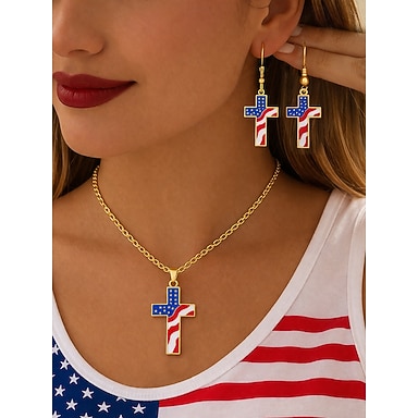 Damen-Halskette und -Ohrringe aus einer Legierung, patriotischer Schmuck in Gold und Silber, Ohrhänger mit Anhänger in Form der amerikanischen Flagge – perfekt für den 250. Jahrestag der USA, den Unabhängigkeitstag, Freizeitkleidung und Urlaub.