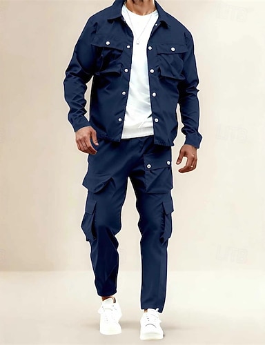 Herren Leichte Jacke Cargo-Jacke Freizeitjacke Set Urlaub Täglich Atmungsaktiv Tasche 2 teilig Frühling Herbst Einfach Mode Klassisch Revers Regulär Schwarz Marineblau Khaki Jacken
