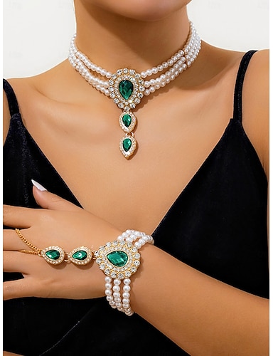 Schmuckset für Damen mit Perlen und Smaragden – elegante Strass-Halskette und Armband für Gesellschaftstänze, Abschlussball oder Abendveranstaltungen