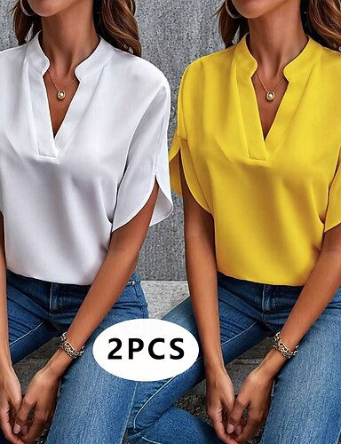 Mehrfachpackungen 2St Damen V Ausschnitt Kurze Ärmel Gelb + blau Bluse Jeans Sexy Rein Einfarbig Lässig Täglich Spandex Sommer