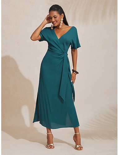 Damen-Wickel-Midikleid aus Tencel-Leinen in Orange-Rot mit V-Ausschnitt und gerafftem Saum