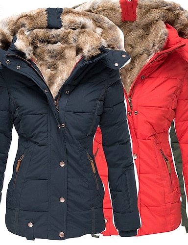 Damen Wintermantel Parka Warm Bequem Fellbesatz Reißverschluss Tasche Pelzkragen Lässig Einfach Urlaub Alltagskleidung Ausgehen Wochenende Regulär Mit Kapuze Normale Passform Langarm Oberbekleidung
