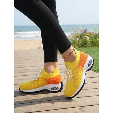 Gelbe Strick-Laufschuhe für Damen – atmungsaktive, leichte Sportschuhe mit luftgepolsterter Sohle, bequemer, sportlicher Stil, ideal zum Laufen, fürs Fitnessstudio, auf Reisen, für Fitness und als