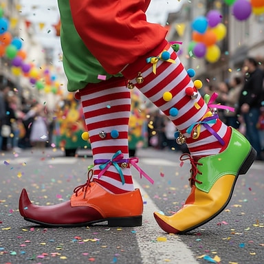 Herren Mardi Gras Bunte Clown Schuhe mit Mehrfarben-Panels und roten Schnürsenkeln Lustiger verspielt Stil für Karneval und Clown Kostüme