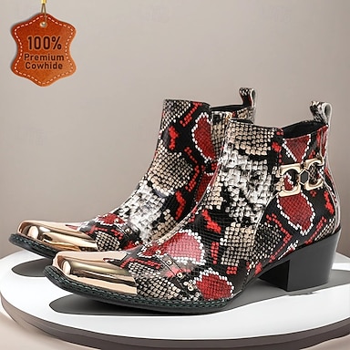 Rote Herren-Ankle-Boots aus Leder mit Schlangenmuster – bequemer Blockabsatz mit Nietenbesatz, ideal für Weihnachtsfeiern und Partys