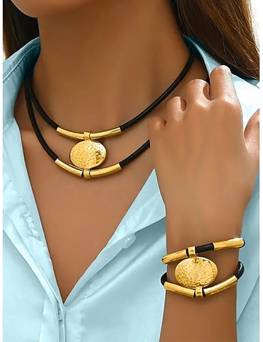 Statement-Halskette und Armband-Set im Boho-Stil für Damen aus Leder und Metall, verstellbar, erhältlich in Gold und Silber – perfekt für Freizeit und Abendgarderobe
