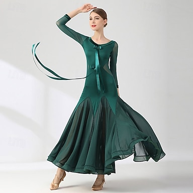 Elegantes Damen-Walzerkleid mit Schleife, fließenden Bändern, transparentem Mesh-Einsatz an der Taille, ausgeschnittenem, weit schwingendem Rock – Tango- und Foxtrott-Kostüm