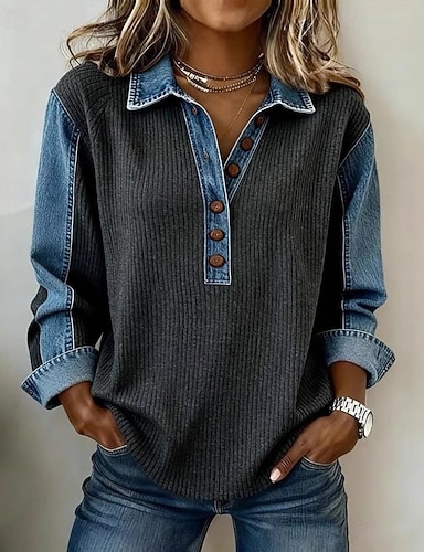Damen Bluse Reißverschluss Knöpfe Einfarbig Stilvoll Lässig Langarm V Ausschnitt Lange Oberteile Täglich Schwarz Wein Purpur Grau Frühling Herbst Winter