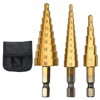 Sechskantgriff-Stufenbohrer-Set mit gerader Nut, titanbeschichtet, 3-teiliges Pagodenbohrer-Set (4–12 mm, 4–20 mm, 4–32 mm) mit schwarzer Stofftasche, hohe Präzision beim Bohren von Metall, Holz und