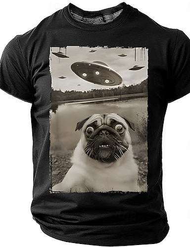 Lustiges Mops-UFO-Raumschiff-Vintage-T-Shirt für Herren, olivgrün, Kurzarm, humorvolles Sci-Fi-Oberteil, Größen S, M, L, XL, XXL, XXXL