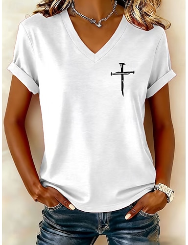 Damen T Shirt Druck Grafik Buchstabe Vintage Stilvoll Klassisch Kurzarm V Ausschnitt Normale Oberteile Täglich Schwarz Weiß Rote Herbst Winter