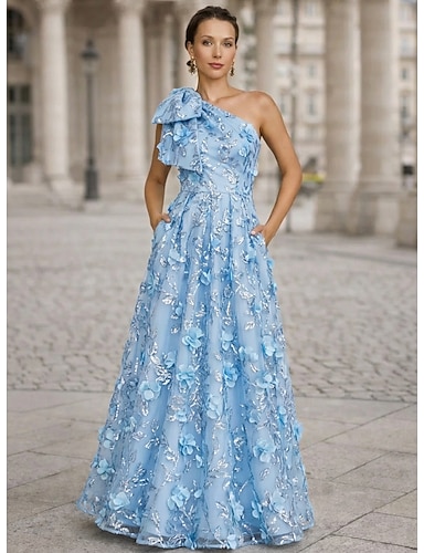 A-Linie Bodenlang Spitzenkleid Abendkleid Elegant Vintage Blumen Ärmellos Ein-Schulter Gartenparty Hochzeit Tasche Satin Tüll mit Gestickte Blume 3D-Blumen Schleife(n)