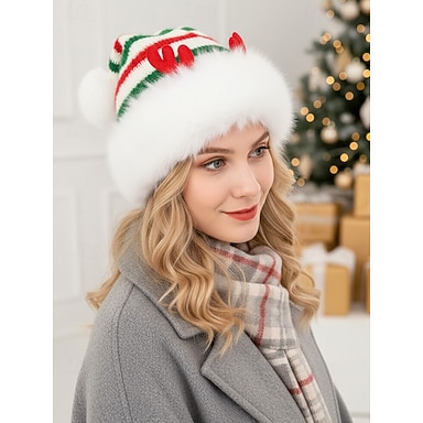 Gestreifte Weihnachtsmütze für Damen mit Rentiergeweih – Polyestermaterial, festliches Design für Weihnachtsfeiern und Winterkleidung