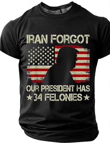 Herren-T-Shirt mit iranischem Aufdruck: „Iran hat vergessen, dass unser Präsident 34 Vorstrafen hat.“ Amerikanische Flaggen-Silhouette, patriotisches politisches T-Shirt mit Grafikprint, lässiges