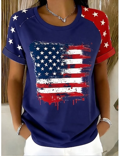 Amerikanischer Unabhängigkeitstag Damen T Shirt T-Shirt Druck Grafik Flagge Stilvoll Klassisch Lässig Kurzarm Rundhalsausschnitt Normale Oberteile Täglich Ausgehen Blau Rote Sommer Frühling