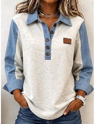 Damen Pullover Sweatshirt Farbblock Lässig Langarm Revers Normale Oberteile Beige Frühling Herbst