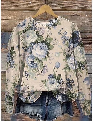 Damen Pullover Sweatshirt Druck Blumen Grafik Warm Aktiv Vintage Langarm Rundhals Normale Oberteile Lässig Straße Alltagskleidung Blau Gelb Rosa Rote Beige Frühling Herbst Winter
