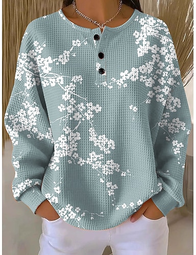 Damen Pullover Sweatshirt Knöpfe Druck Blumen Grafik Geometrisch Vintage Lässig Langarm Rundhalsausschnitt Normale Oberteile Lässig Straße Alltagskleidung Blau Hellblau Weiß Orange Frühling Herbst