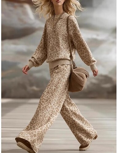 Damen Hosen-Sets Bolero-Oberteil Pullover Langarm Rundhals Leopard Mode Streetwear Lässig Täglich Outdoor Braun Frühling Lässiger Schnitt