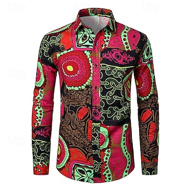 Herren Ethnisch Komplizierte Blumen Blumen Hemd Satinhemd Kleidhemd Langarm Vintage-Retro Urlaub Alltagskleidung Sommer Frühling Herbst Umlegekragen 3D-Druck Hemden mit Knopfleiste Hellgrün Rote Blau