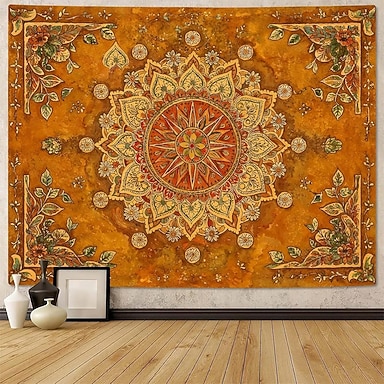 Senfgelber Mandala-Wandteppich im Vintage-Boho-Stil mit floralem Muster, großformatig, in Erdtönen gehalten, Wanddekoration, Hintergrundstoff, Poster