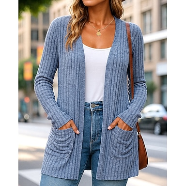 Damen Pullover Strickjacke Elegant Mode Lässig Einfarbig Gerippt V Ausschnitt Öffnung vorne Tasche Gestrickt Langarm Normale Oberteile Stricken Täglich Outdoor Wochenende Blau Schwarz Herbst Winter