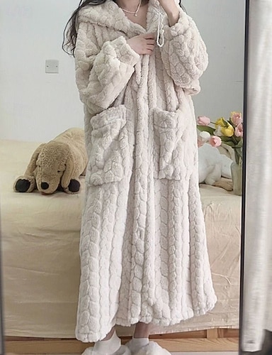 Damen Schlafanzug Freizeitkleidung Flanell Warm Mode Tragbarer Decken-Hoodie Einfarbig Tasche Strickjacke Kleid Urlaub Heim Bett Langarm Rundhalsausschnitt Beige Herbst Winter Lässiger Schnitt
