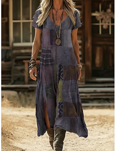 Damen Maxikleid Boho-Kleid Freizeitkleid A Linie Kleid Druckkleid Vintage Outdoor Urlaub Wochenende Lässiger Schnitt Grafik Farbblock Kurzarm V Ausschnitt Purpur Sommer Frühling