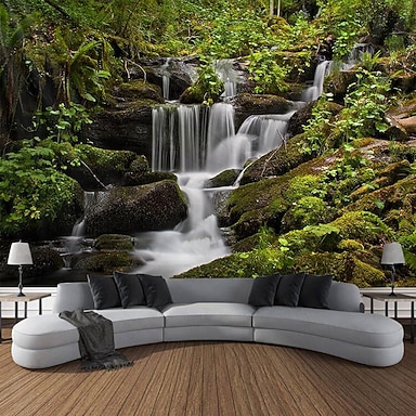 Wandteppich mit moosbewachsenem Wasserfall im tiefen Wald – Naturlandschaft, grünes Waldgebiet, kaskadenartiges Wasser – Wandbehang für Wohnzimmer, Schlafzimmer, Büro, Kunstwandbild, Hintergrund