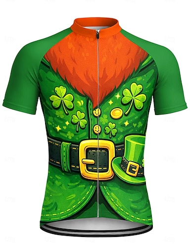 Herren St. Patrick Jersey Radsport-Jersey Downhill-Jersey Vierblättriges Kleeblatt St. Patrick's Elf Kurzarm-Rad-T-Shirt Top mit 3 Rückentaschen UV-beständig Schnell trocknend mit Taschen