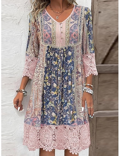 Damen Knielanges Kleid Boho-Kleid Spitzenkleid Vintage-Kleid Freizeitkleid Elegant Mode Modern Outdoor Urlaub Ausgehen Normale Passform Blumen Dreiviertelarm V Ausschnitt Rosa Sommer Frühling