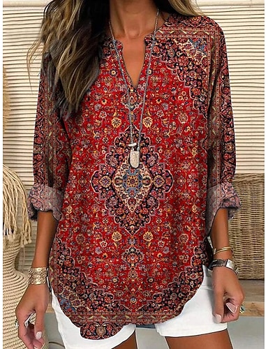 Damen Bluse Leinenähnlich Atmungsaktiv Leicht Tunika V-Ausschnitt Lange Ärmel Boho Lässig Oberteile Geometrisch Paisley Vintage Alltag Stylisch Eingekerbter Ausschnitt Alltag Resort Wear Druck Maroon