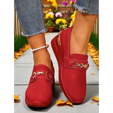 Rote Slip-On-Loafers für Frauen – Bequeme Wedge-Schuhe mit goldener Kettenverzierung für Gehen Einkaufen und Herbstmode-Outfits