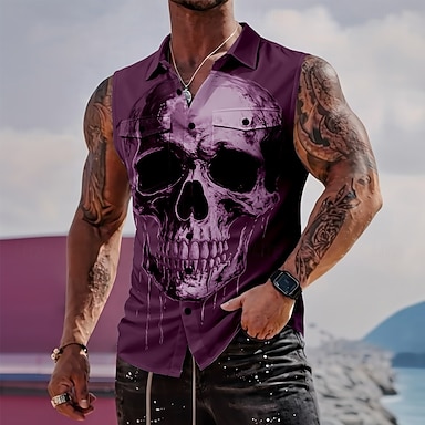 Herren Schädel Skelett Horror Hemd Knopfhemd Ärmelloses Shirt Ärmellos Dunkler Gothic-Stil Outdoor Lässig Sommer Frühling Umlegekragen 3D-Druck Zwei Fronttaschen Blau Rosa Purpur Grün