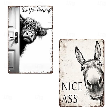 2er-Pack lustige Badezimmerschilder im Vintage-Stil, Hochland-Design: „Sind Sie gerade auf dem Klo?“, Esel „Schöner Hintern“, Wanddeko