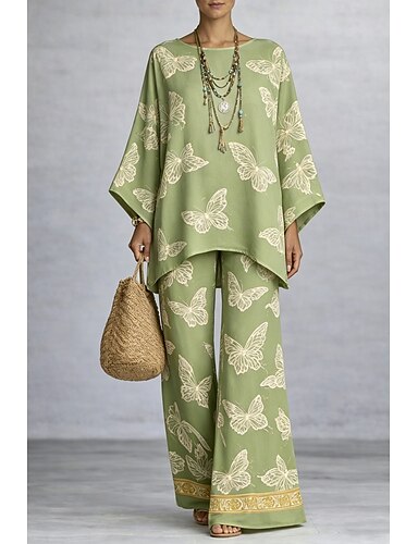 Damen Hosen-Sets Langarm Rundhals Grafik Schmetterling Druck Mode Streetwear Lässig Täglich Outdoor Blau Weiß Rosa Sommer Lässiger Schnitt