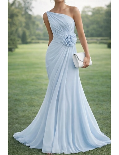 A-Linie Bodenlang Abendkleid Ballkleid Elegant Mutter der Braut Ärmellos Ein-Schulter Hochzeit Formell Chiffon mit Gestickte Blume Falten Gerafft