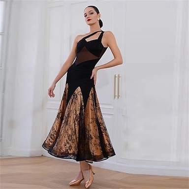 Ballsaal-Tanzkleid für Damen, schwarze Spitze, Patchwork-Netz, asymmetrische Schulter, elegantes Tango-Rumba-Wettbewerbskleid