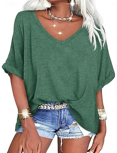 Damen T Shirt T-Shirt Einfarbig Mode Stilvoll Klassisch Kurzarm V Ausschnitt Lange Oberteile Täglich Ausgehen Wochenende Schwarz Weiß Wein Grün Kaffee Sommer Frühling
