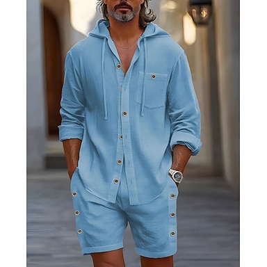 Herren Leinenhemd T-Shirt Anzüge 2-teiliges Outfit T-Shirt und Shorts Langarm Mit Kapuze Sommer Frühling Einfach Mode Lässig 2 teilig Button-Down Urlaub Alltagskleidung Ausgehen Schwarz Weiß Kaki Top