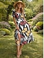 Damen-Midikleid Leinenähnlich Atmungsaktive Leichte Sommerkleid A-Linie Kleid Urlaub Legere Boho Strand Lockere Passform Grafik Geometrisch 3/4 Länge Ärmel V-Ausschnitt Blau Schwarz Braun Grün Sommer
