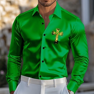 St. Patrick's Day Herren Kreuz Satin Hemd Dress Shirt Button Up Shirt Langarm Fashion Lässig Urlaub Sommer Frühling Umgeschlagen Kragenhemden 3D Druck Schwarz Weiß Grün