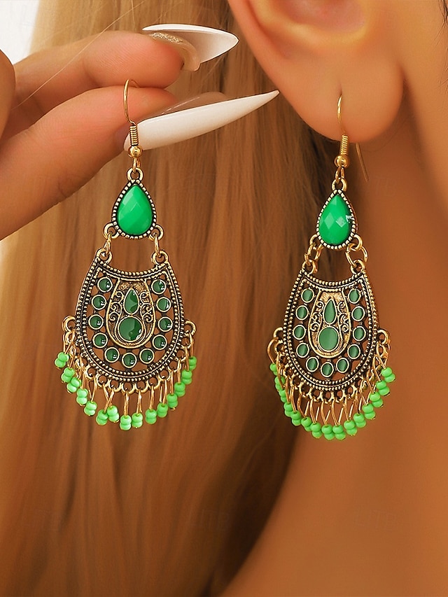 Women's Bohemian Teardrop Dangle Earrings – Vintage Tribal Style with Beaded Fringe, Lightweight Statement Jewelry for Parties and Festivals#15030078