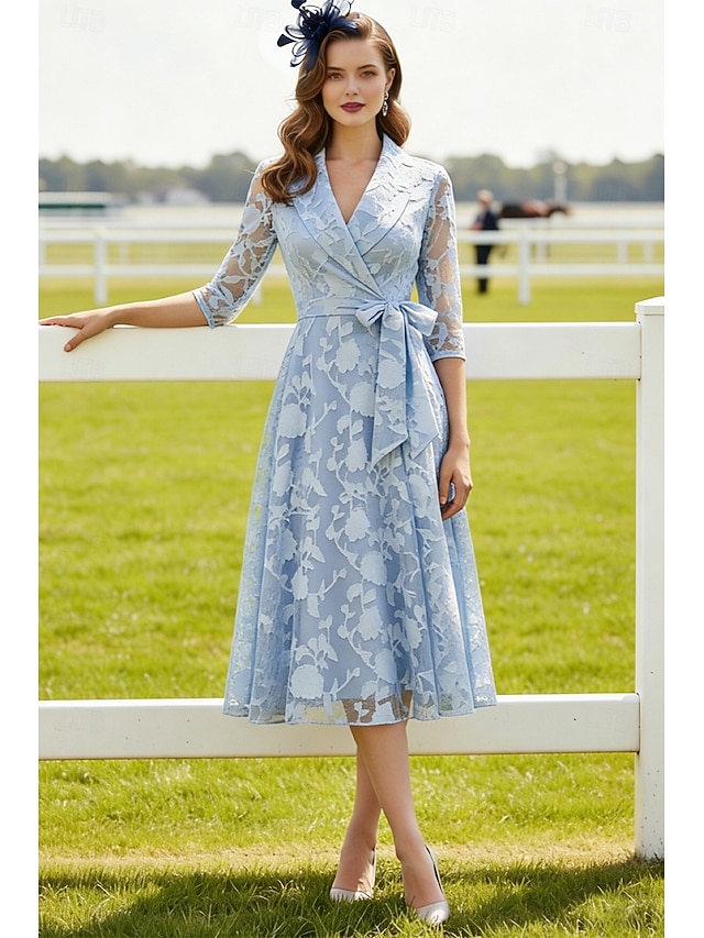 A-Line Tea Length Blazer Dress Formal Dresses Mother of the Bride Dress Long Sleeve Shirt Collar Elegant Vintage Formal Wedding Guest Kentucky Derby Chiffon Satin Jacquard with Bow(s) Pleats Flower