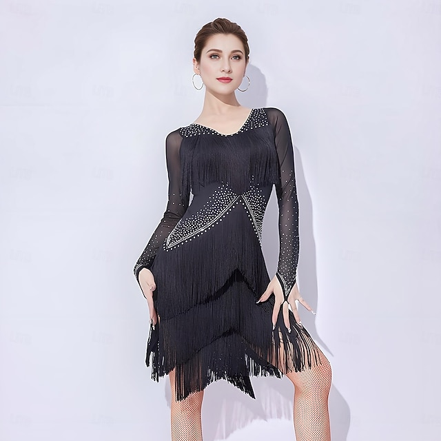 Gender:Women's,Style:Fashion,Occasion:Training,Performance,Category:Latin Salsa Dance,Fabric:Milk Fiber,Mesh,Sleeve Length:Long Sleeve,Embellishment:Splicing,Tassel,Rhinestone,Neckline:V Neck,Age Group:Highschool,Adults,Built-In Bra:No,What's in the box:Dress,