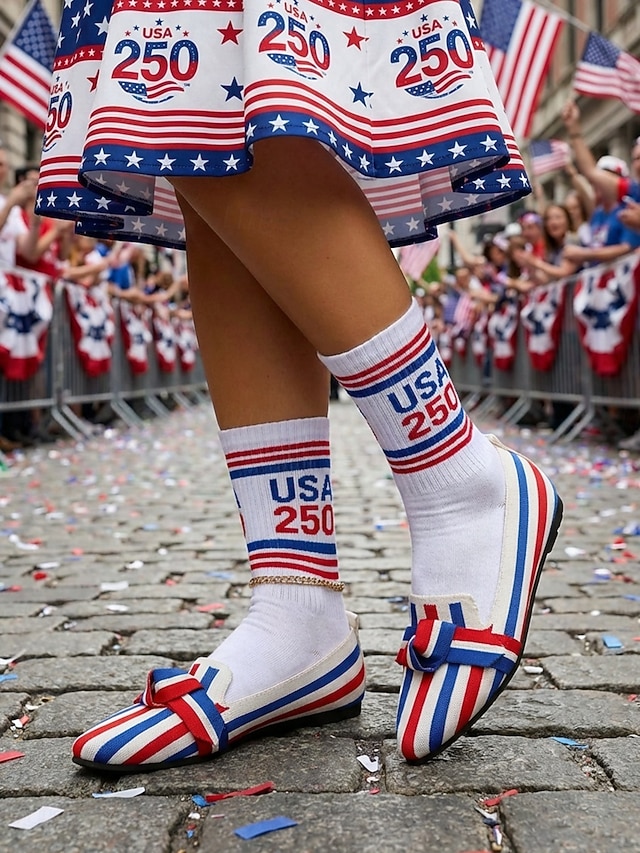 Women's Patriotic Knit Flats – Pointed Toe Flat Shoes with Bow Detail for Independence Day, United States Anniversary, Summer Picnics & Casual Wear #13185752