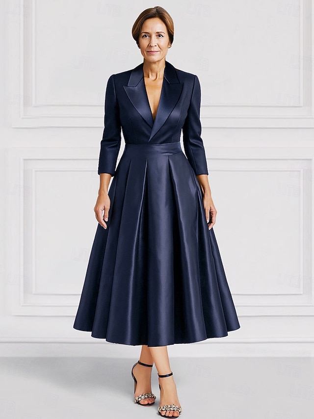 Women's Tuxedo Dress A-Line Formal Wedding Guest Satin Silk Elegant Vintage Long Sleeve Tea Length Peak Lapel #15814608