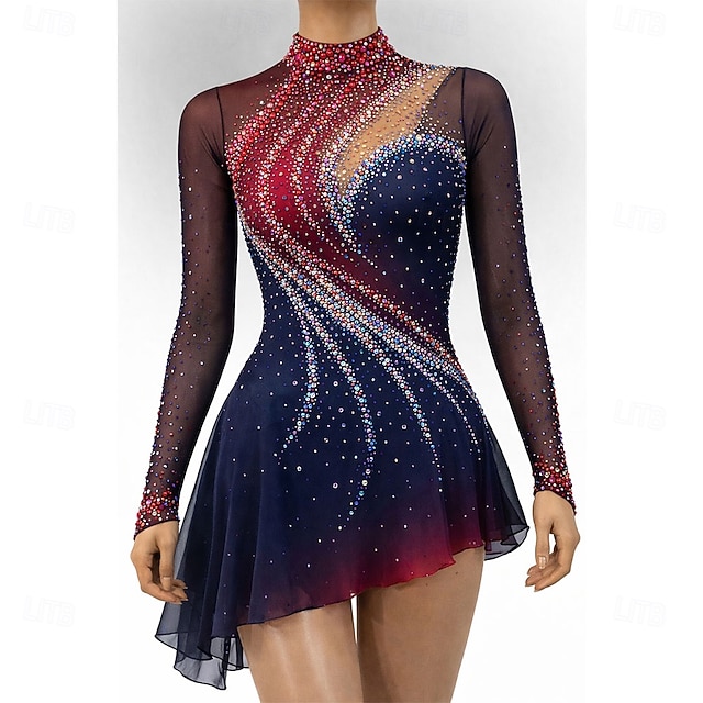 Figure Skating Dress Women's Ice Skating Dress Blue+Red Patchwork Open Back High Elasticity Training Competition Skating Wear Classic Crystal / Rhinestone Long Sleeve Ice Skating Figure Skating