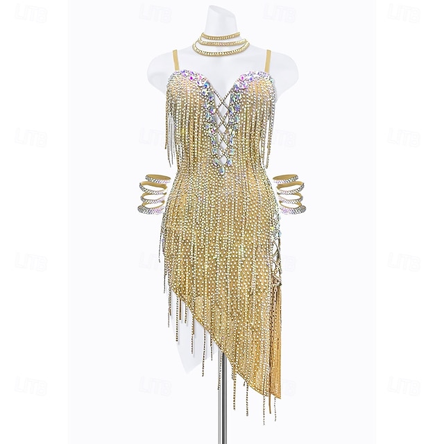 Gender:Women's,Style:Elegant,Stylish,Occasion:Training,Performance,Category:Latin Dance,Fabric:Spandex,Polyester,Sleeve Length:Sleeveless,Embellishment:Tassel,Crystals / Rhinestones,Splicing,Waistline:High ,Age Group:Adults,What's in the box:Dress,